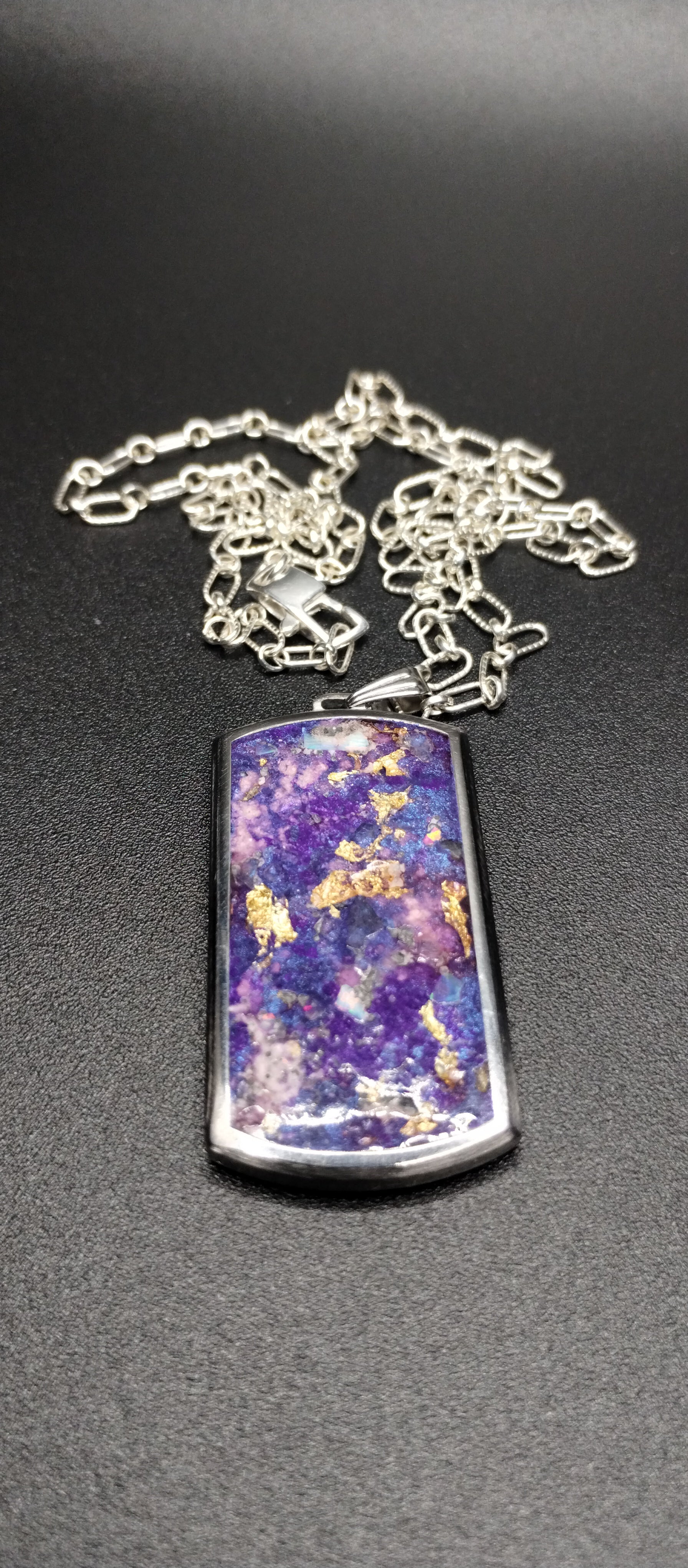Elevate your style with our Joe Rhino Cobalt chrome 1 of a kind Dog tag style pendant featuring 24k gold flake and exquisite crushed Opal. The high polish front glistens with water sapphire pearl white opal, deep space opal, and diamond dust, creating a luxurious and unique piece. This pendant comes with an 18-inch sterling silver chain and clasp, making it the perfect accessory for any discerning individual.